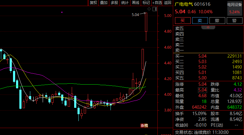 电力斥地股连续保握强势,电网斥地场地领涨,板块指数盘中一度放量飙升近7%,再创历史新高。汉缆股份、森源电气等多股开盘一字涨停,广电电气(601616)则在开盘后仅约1分钟垂直涨停,纠合第2日封板,双杰电气、亿能电力等逾10股涨停或涨超10%。