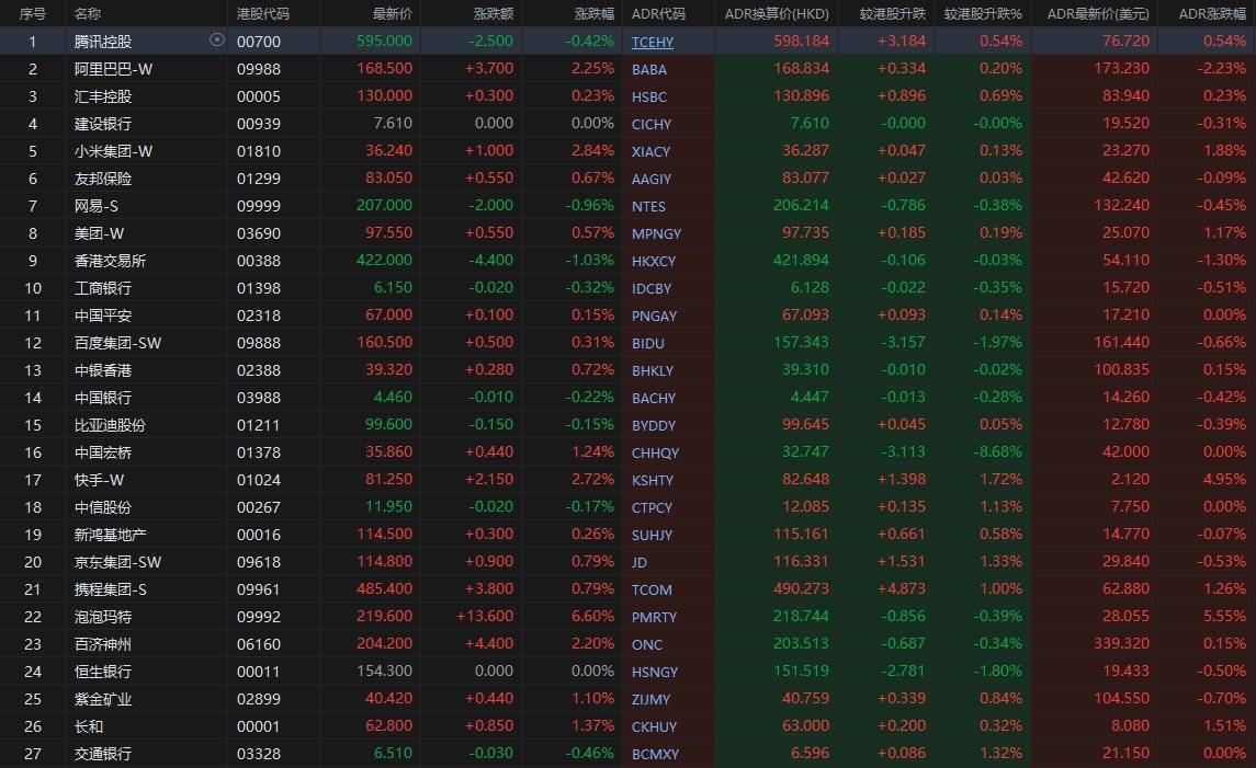 大型蓝筹股涨跌不一,汇丰控股收报130.896港元,较香港收市涨0.69%;腾讯控股收报598.184港元开云官网切尔西赞助商,较香港收市涨0.54%。