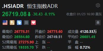 智通财经APP获悉,周五,好意思股三大指数涨跌不一。恒生指数ADR下落,按比例野心,收报26719.08点,较香港收市跌30.43点或0.11%。