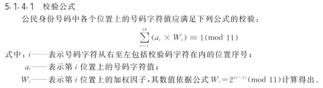 身份证终末一位的算法秉承的是 ISO 7064 《数据料理——校验符系统》中给出的 MOD 11-2 校验码系统。这里的MOD 11-2示意模数是11,基数是2。也即是校验公式(见下)中,需要将总和除以11(模数)并取尾数,而每个位置上的加权因子是通过以2(基数)为底的几何级数算出来的。