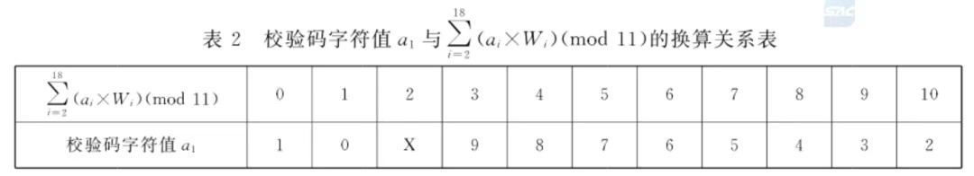 为了绵薄缠绵,国度活动中平直给出了校验码a1和尾数的换算联系对应表: