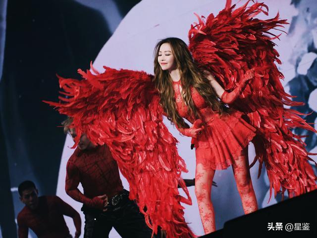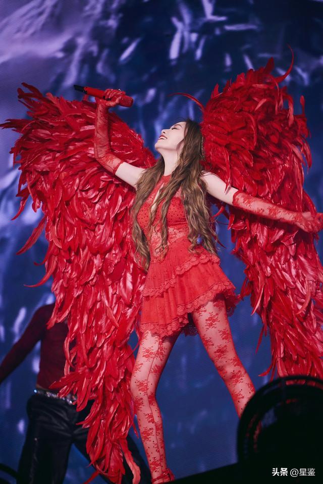 最惊艳的还要数背后那对巨型红色羽毛翅膀,一出场径直把舞台氛围感拉满,像从童话里走出来的红色天神,气场全开又不失柔好意思。搭配同色系的绑带高跟鞋,双腿线条被无穷拉长,舞台上每一个算作齐又好意思又有劲量。