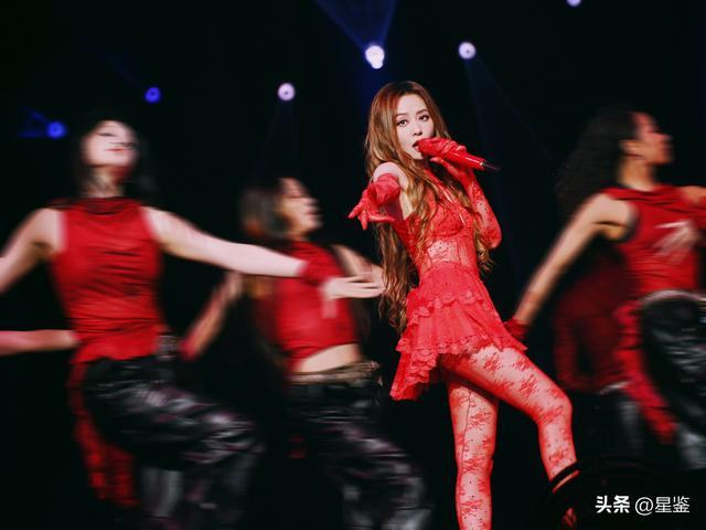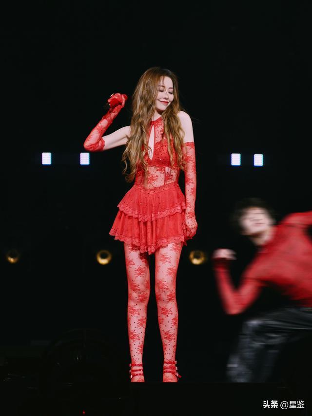 她这套造型的妙处,在于把“红”的张力玩到了极致。正红色蕾丝透视短裙,胸前的镂空绸缪恰到平允,既勾画建立材弧线,又十足不低俗;层叠的蕾丝裙摆灵动萧洒,舞蹈时自带氛围感,短款绸缪还能拉长腿部比例,显高又显瘦。同色系的蕾丝手套和红丝绒印花丝袜,重新到脚的红色彩和感超强,细碎的闪钻点缀在面料上,舞台灯光一打,通盘这个词东说念主齐在发光,短暂成为全场焦点。