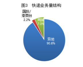 1-3月,同城、异域、海外/港澳台快递业务量别离占沿路快递业务量的7.0%、90.8%和2.2%。与前年同时比拟,同城快递业务量的比重下跌1.0个百分点,异域快递业务量的比重高涨1.1个百分点,海外/港澳台业务量的比重下跌0.1个百分点。